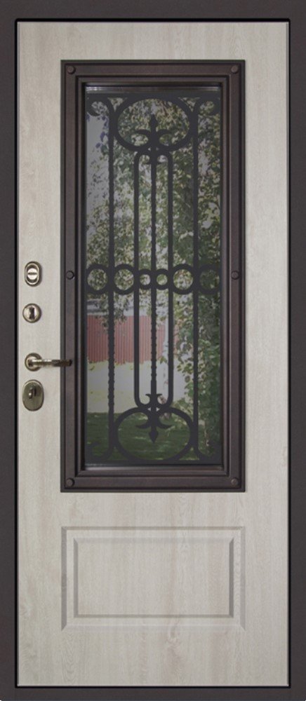Панель МДФ 16 мм. Цвет "сосна белая". Объемная фрезеровка. Прижимная рамка. Широкий багет. Стеклопакет.